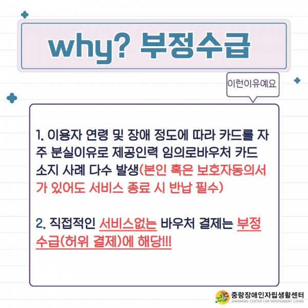 위와 같은 부정결제 발생 시 전자바우처 시스템으로 자동 전송되며 해당 행위에 대한 소명자료를 요구할 수 있고, 부정결제 적발 시 이용자는 활동지원급여의 중단 또는 제한될 수 있습니다.