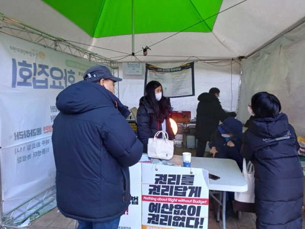 이에 행동으로 여의도 이룸센터 앞에서 장애인권리보장법, 장애인탈시설지원법 제정 위한 농성장을 차례졌음.